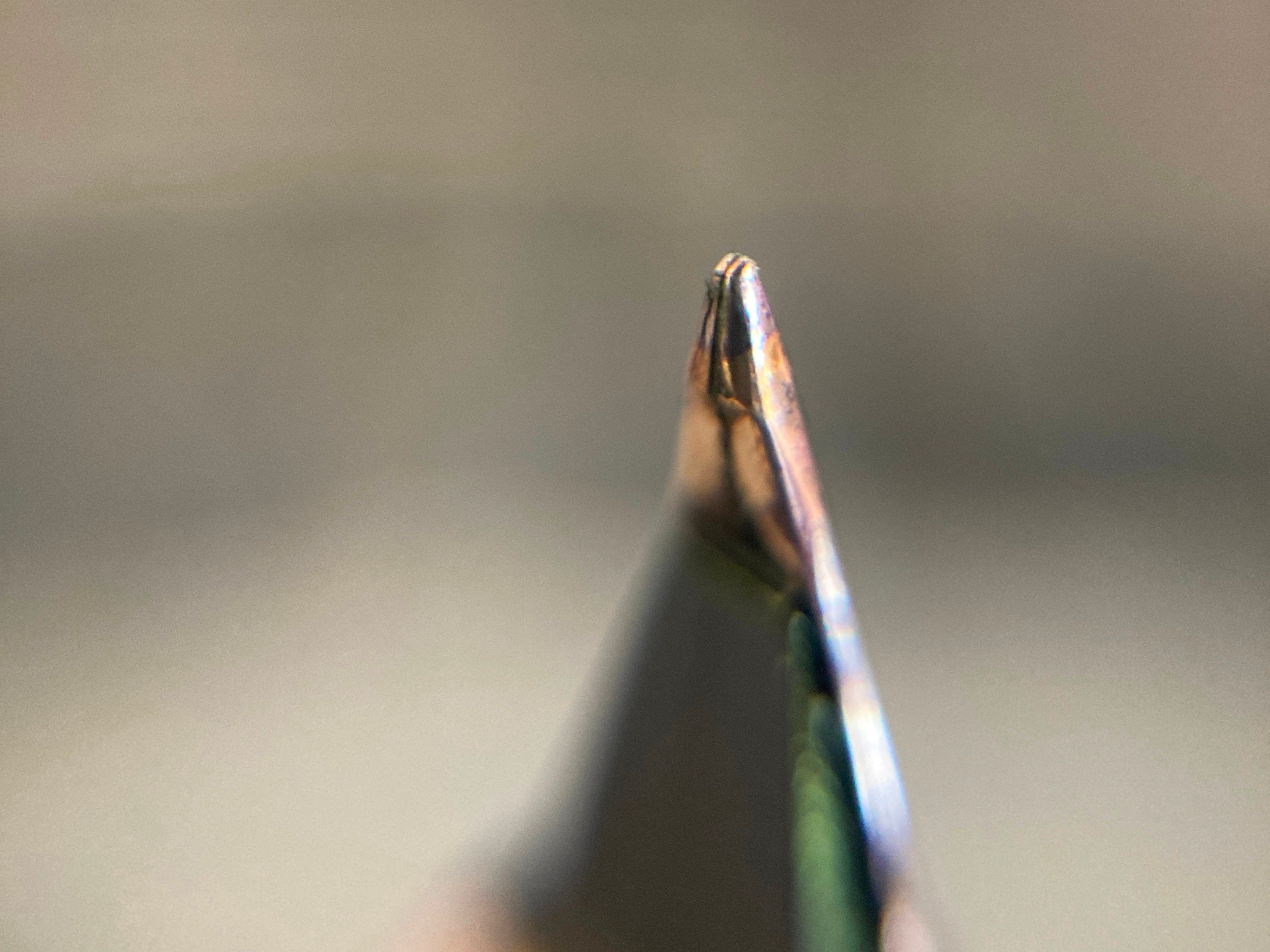 This one is done by CY. It came from a very broad nib, and I find the form to be beautiful. It has a flat bottom, and the top slopes down to meet it. Also, there are prominent diagonal facets. I haven’t mentioned it in these articles, but I look up to his approach the most out of any nib worker. For a long time, I struggled to produce grinds the way I envisioned them. I felt like I was fighting my tools and technique to get the look and feel I wanted. Now, thanks to his help, that’s no longer an issue.