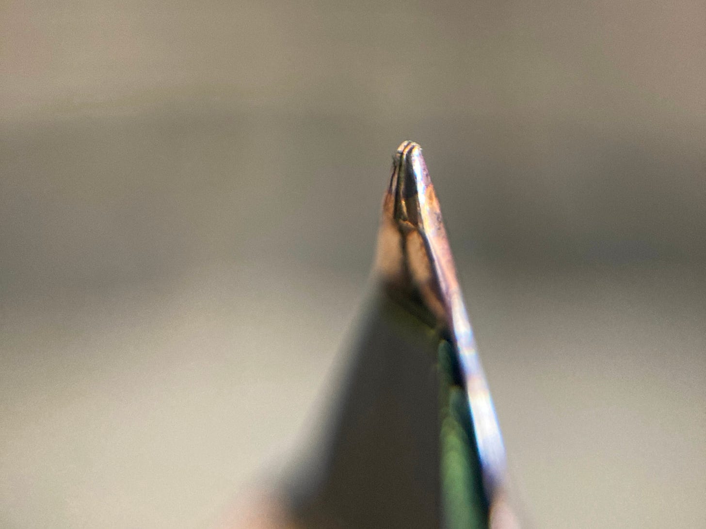 CY and Kirk demonstrate what to do when a nib doesn’t easily lend itself to becoming a needlepoint. They both angle their rough cuts like a cone or pyramid, and they both do diagonal cuts on the bottom of the tipping. These cuts produce a sharp point with the least amount of material removal. Diagonal cuts especially keep me from forming a micro-italic, as pictured below. The major difference between their needlepoints is the bottom, and I have already discussed my preference for flat bottoms.